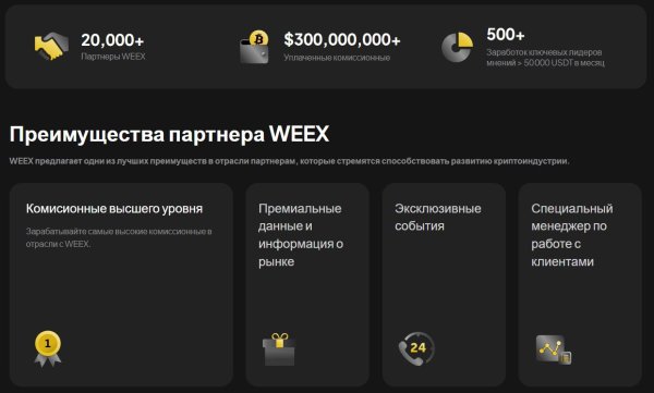 • Реферальная программа: До 50% от комиссии приглашённых пользователей • Партнёрская программа: Для блогеров, трейдеров и лидеров мнений — бонусы, премиум-доступ и персональный менеджер • Более 20 000 партнёров уже заработали более 300 млн $ с WEEX