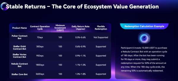 Nebula Срок работы депозита: 180 дней Минимальный депозит: 100$ Процентная ставка: 1.1% - 1.3% в сутки Гибкое погашение депозита: Да Доходность: 198% - 234%