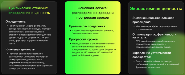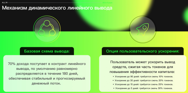 30% от дохода реинвестируется в стейкинг на тариф выше вашего текущего. 70% направляется в контракт линейного вывода и блокируются. Вы можете подать запрос на равномерное извлечение средств в течение 180, 90, 30, 15 или 5 дней. Если выбираете 180 дней, то комиссий не будет, а если меньше, то уже придётся сжечь от 10% до 30% токенов.