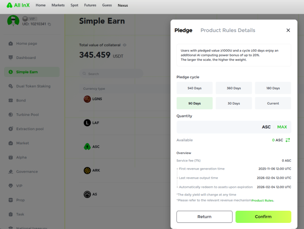Далее идём во вкладку Simple Earn, находим в списке токен ASC и жмём Piedge. Выбираем срок стейкинга. 30 дней лучше не брать, так как комиссия сожрёт всю доходность. Хотя бы 90 дней берём.