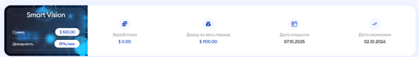 Smart Vision Срок работы депозита: 12 месяцев Минимальный депозит: 100$ Начисления: 5 и 25 числа каждого месяца Процентная ставка: 15% месяц Итоговый доход: +180%