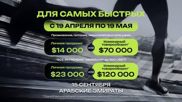 В случае достижения на $23 000 (личные продажи) или $120 000 (командой) - билет ВСЕ ВКЛЮЧЕНО! (авиабилет, проживание, питание, мероприятия, гала-ужин) 💎