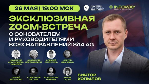 В ходе встречи Виктор Копылов расскажет о бизнес-возможностях, открывающихся перед акционерами Si14 AG и партнерами INFOWAY. Кроме того, руководители подразделений поделятся информацией и новостями.