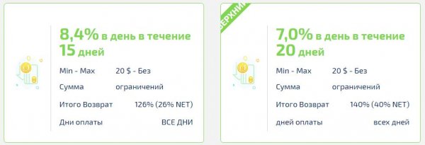 Тариф 1 Срок работы депозита: 15 дней Минимальный депозит: 20$ Максимальный депозит: Без ограничений Начисления: 8.4% в сутки Ваш депозит включён в выплаты и отбивается за 12 дней Доход за срок: +26%