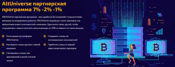 Я плачу отличный 100% РефБэк по Alt-Universe (7% от вашего депозита) Так же 50% РефБэка от реферала 2го уровня (1% от депозита вашего реферала)