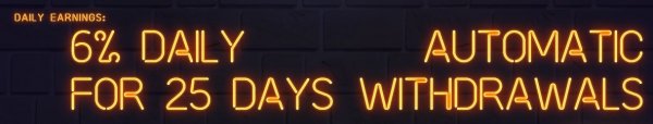 Срок работы депозита: 25 дней Минимальный депозит: 10$ Максимальный депозит: Без ограничений Начисления: 6% в сутки Ваш доход: +50%