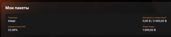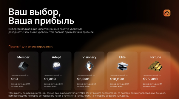 Срок работы депозита: До 300% начислений Минимальный депозит: 50$ Максимальный депозит: Без ограничений Процентная ставка: От 20% до 30% в месяц Выход в безубыток за 4 - 5 месяцев, в зависимости от суммы депозита Итоговая прибыль: +200%