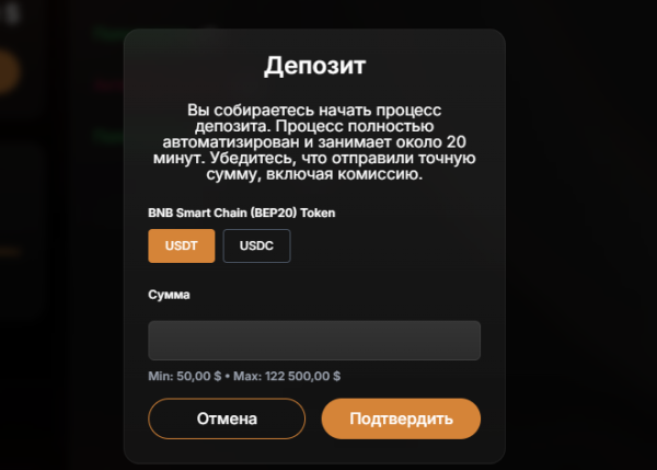 Открыть депозит в проекте очень просто. На главной странице нажмите кнопку Депозит. Далее выбираете стейблкоин, я всегда работают с Binance Smart Chain, так как комиссии маленькие. Вписываете сумму депозита и жмёте подтвердить. Далее вас направит на платёжный агрегатор, обратите внимание, что он берёт комиссию. Переводите ровно столько, сколько там написано. После подтверждения агрегатора, которое занимает не более 20 минут, ваш депозит будет активирован.