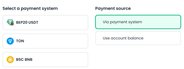 Выплаты: Инстант Комиссия на вывод: Нет Минимальная сумма вывода: 5 USDT, 1 TON, 0.01 BNB Платежные системы: USDT BEP20, BNB, TON