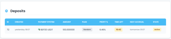 У проекта интересный рандомный маркетинг. Вам будет выпадать тариф от 8 до 48 часов. Доходность от 1% до 15% за срок тарифа. С таким маркетингом лучше дробить депозит, чтобы словить медианную тарифов. Мне вот выпал тариф на 31 час и 6.46% профита.