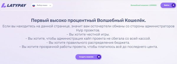 Первый высокопроцентный волшебный кошелёк, созданный на платёжной системе LatyPay. Сейчас в индустрии переломный момент, многие обожглись и продолжают обжигаться. Многие теряют. Адекватное желание инвестора: - Честный проект - Высокий процент прибыли для отбития убытков - Короткий срок инвестирования