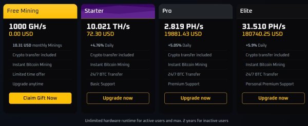 За регистрацию в проекте даётся бонус в размере 1 TH/s. Это позволит зарабатывать бесплатно 10 USDT в месяц. Но вывести вы их сможете только если активируете свой депозит.