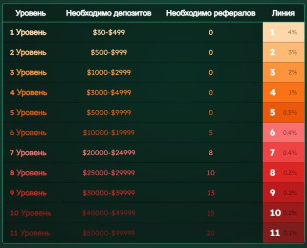 Партнерское вознаграждение: 4% - 3% - 2 - 1% от депозита рефералов (всего 11 уровней в глубину, которые открываются при достижений определенных условий)