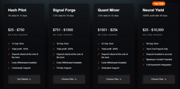 Проект имеет 2 тарифных плана. Один на 15 дней, с начислениями по 3% в сутки и общей доходностью 45%. И второй тариф на 30 дней, с начислениями 3.5% в сутки и общей доходностью 105%.