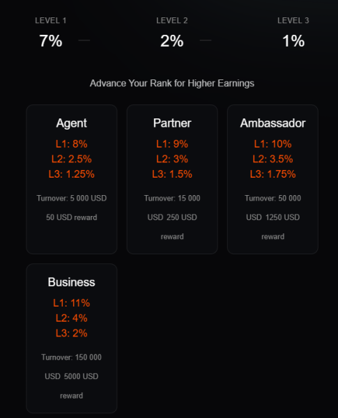 Партнерское вознаграждение: 7% - 2% - 1% от депозитов рефералов