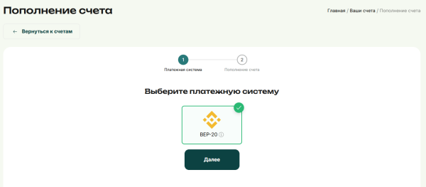 Чтобы открыть депозит, перейдите сначала в раздел Счета и нажмите кнопку Пополнить. Далее выберите предложенную криптовалюту, это USDT в сети Binance Smart Chain. Жмёте кнопку Далее и вам предоставят адрес, на который необходимо направить средства. После подтверждения, ваш баланс будет пополнен.