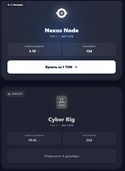 Cyber Rig - 2 активных майнера Срок работы: 25 дней Стоимость: 5 TON Доход: +25%