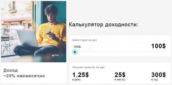 Доходность: 1.25% в сутки или около 25% в месяц. Начисления: по будним дням (с Пн – по Пт). Минимальный депозит: 50$. Максимальный депозит: 100 000$. Срок работы вашего депозита: 1 год. Выход в безубыток: через 80 рабочих дней (это 112 календарных дней). Чистая прибыль: более 200%.