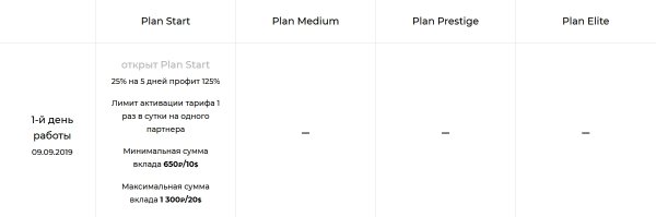 1. Plan «Start». Срок работы депозита: 5 дней. Минимальный депозит: 10$. Максимальный депозит: 100$ (после 4 повышений). Начисления: 25% в сутки. Выход в безубыток: через 4 дня. Чистая прибыль: 25%.
