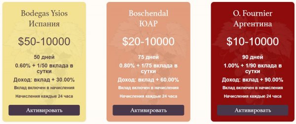 [quote]Возьмём за пример тариф Bodegas Ysios (Испания). За 50 дней ваш доход от депозита в 100$ составит 30$ и 166$ от вашей активности. А это 196$ или +196% от вашего депозита за 50 календарных дней.[/quote]