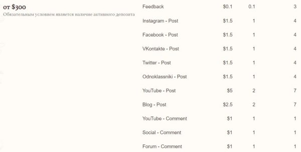 Если ваш депозит от 300$, вы можете дополнительно зарабатывать по 0.1$ и 0.1 баллу за один отзыв на сайте проекта каждые 3 дня. Так же вы можете получать по 1.5$ и 1 баллу, каждые 4 дня за пост в вашем Instagram аккаунте. За пост в FaceBook, Вконтакте, Twitter и Одноклассниках по 1.5$ и 1 баллу каждые 4 дня. За пост на YouTube по 5$ и 2 балла каждые 7 дней. За пост на блоге 2.5$ и 2 балла каждые 7 дней. За комментарии в социальных сетях, форумах и YouTube по 1$ и 1 баллу каждый день.