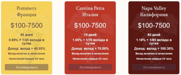 Napa Valley (Калифорния) Срок работы депозита: 85 календарных дней Минимальный депозит: 100$ Максимальный депозит: 7 500$ Начисления: 1.18% в сутки + 1/85 вашего депозита = 2.35% в сутки Ваш депозит включён в выплаты Доход по итогу: +100.3%