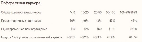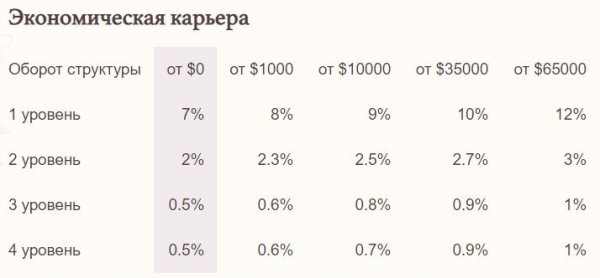 У проекта шикарная партнёрская программа, которая позволяет зарабатывать с 4-х уровней в глубину. При чём при наборе оборотки структуры вы будете получать всё больший и больший процент реферального вознаграждения.