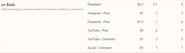 Если ваш депозит от 100$, вы можете дополнительно зарабатывать по 0.1$ и 0.1 баллу за один отзыв на сайте проекта каждые 3 дня. Так же вы можете получать по 1$ и 1 баллу, каждые 3 дня за пост в вашем Instagram аккаунте. За пост в FaceBook по 1.5$ и 1 баллу каждые 5 дней, за пост на YouTube по 5$ и 2 балла каждые 7 дней. За комментарии в социальных сетях и YouTube по 1$ и 1 баллу каждый день.
