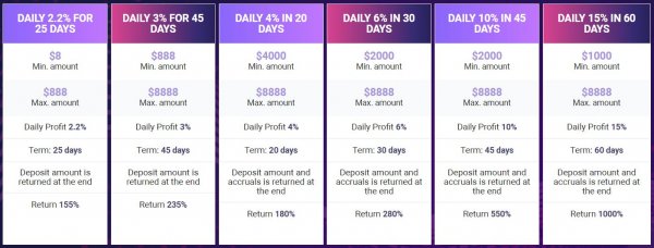 Тариф 1 Срок работы депозита: 25 дней Минимальный депозит: 8$ Максимальный депозит: 888$ Начисления: 2.2% в сутки Депозит возвращается в конце срока Ваш доход: +55%