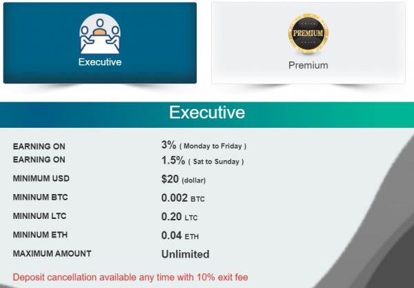 Executive Срок работы депозита: Бессрочно. Вывод в любое время Комиссия за снятие депозита: 10% от суммы депозита Минимальный депозит: 20$ / 0.002 BTC / 0.2 LTC / 0.04 ETH Максимальный депозит: Без ограничений Начисления: 3% в будни и 1.5% по выходным Таким образом через 4 рабочих дня вы выходите в безубыток по комиссии и уже можете в любое время забрать депозит себе в профит. За 30 дней участия в проекте ваша чистая прибыль: +62%