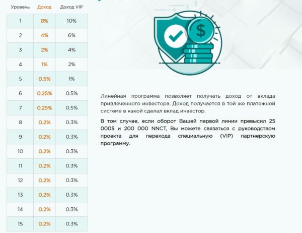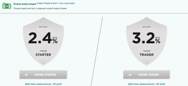 Trader Срок работы депозита: 90 дней Минимальный депозит: 10 USD / 111.11 NNCT Максимальный депозит: 5000 USD / 55555.56 NNCT Начисления: Ежедневно Процентная ставка: 1.2% - 2.64% (для долларов) в сутки в зависимости от уровня риска Ваш доход в USD: 8% - 137% Процентная ставка: 1.44% - 3.16% (для NNCT) в сутки в зависимости от уровня риска Ваш доход в NNCT: 29.6% - 184%