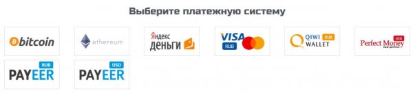 У проекта обширный выбор платёжных систем. Есть и доллары и рубли, так же банковские переводы, вы можете выбрать для инвестиции и криптовалюты. Но стоит отметить, что идёт конвертация по фиксированному курсу: 1 USD = 75 рублей 1 BTC = 7 000$ 1 ETH = 150$
