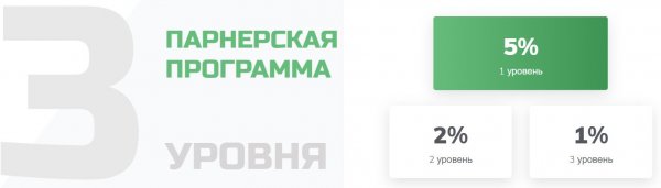 Партнерское вознаграждение: 5% - 2% - 1% от депозита реферала