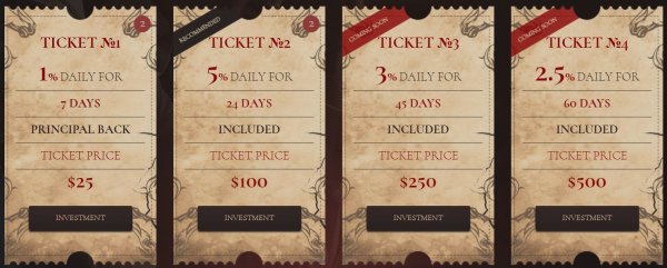 Ticket 2 Срок работы депозита: 24 дня Количество билетов на 1 аккаунт: 2 Стоимость билета: 100$ Начисления: 5% в сутки Депозит включён в выплаты и отбивается за 20 дней Ваш доход: +20%
