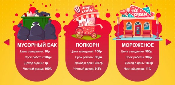Ларёк попкорна Срок аренды: 30 дней Стоимость: 100 рублей Начисления: 3.66% в сутки Ваш чистый доход: +9.8%
