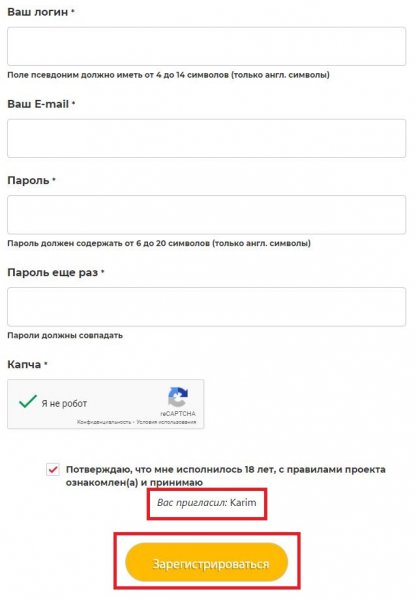 Заполните форму регистрации, проследите, чтобы пригласитель был Karim.