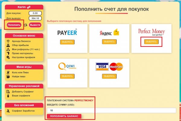 Чтобы открыть депозит, а точнее арендовать бизнес, надо пополнить баланс. Нажмите кнопку Пополнить