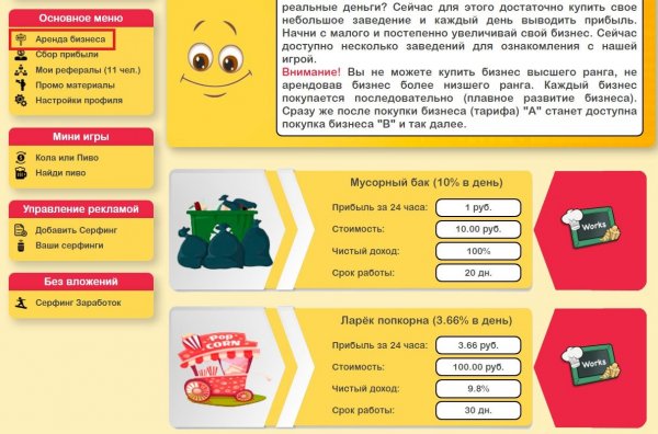 Суть игры заключается в том, что вы арендуете бизнес на 30 дней. Всё это время вам начисляется процент. По окончанию срока аренды, процент перестаёт вам начисляться. Всё достаточно просто.