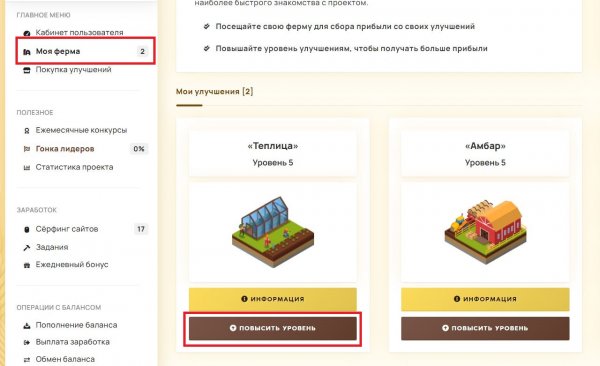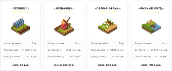 Овечья ферма Стоимость: 500 рублей Улучшение до 5го уровня: 60 500 рублей Начисления: 1.18% в сутки = 35.5% в месяц Ваш доход: +113%