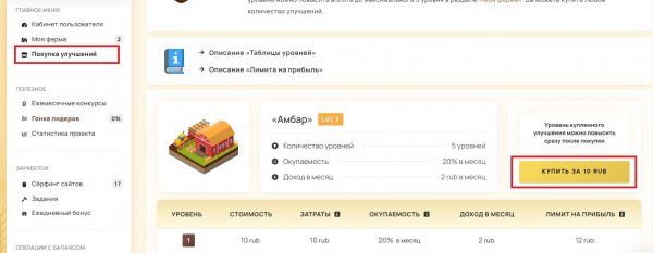 Амбар Стоимость: 10 рублей Улучшение до 5го уровня: 1 210 рублей Начисления: 1% в сутки = 30% в месяц Ваш доход: +80%