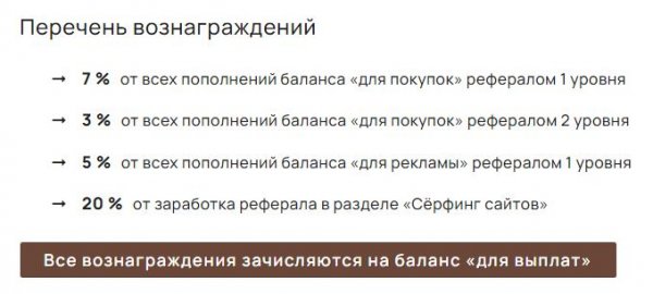 У проекта отличная реферальная система, позволяющая очень хорошо зарабатывать на приглашении партнёров. Вы будете получать бонус от пополнения баланса покупок, что сделают ваши рефералы до 2-х уровней в глубину.