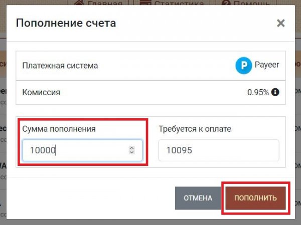 Далее введите сумму депозита и нажмите Пополнить