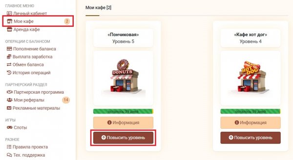 Далее переходите в раздел Моё кафэ И там у своего кафэ нажмите Повысить уровень