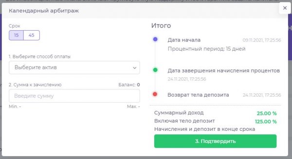 Согласно условиям данного направления, все начисления происходят в конце срока. То есть здесь нет ежедневных начислений. Так же, чтобы инвестировать на тариф в 45 дней, необходимо сначала инвестировать на 15 дней.