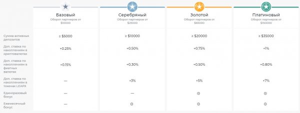 Я плачу отличный 200% РефБэк по Leapex (6% от вашего депозита) Так же 200% РефБэк 2го уровня (2% от депозита вашего реферала) При реинвестировании с баланса РефБэк есть. Если ваш вклад в криптовалюте от 85$, заказывать РефБэк в соответствии с криптой. Во всех остальных случаях, а так же если вклад через BitCoin и ETH, РефБэк платится исключительно на PerfectMoney