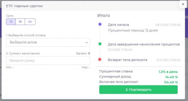 Это более стабильный и спокойный вариант инвестирования. Вы выбираете срок инвестирования и открываете депозит. Ежедневно получаете процент и по окончанию работы депозита, можете либо реинвестировать, либо вывести.