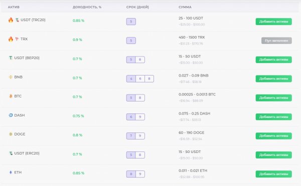 Проект работает исключительно с криптовалютой, но благо выбрать здесь есть из чего. Есть так же USDT TRC20 и BEP20. Кроме того крипта не конвертируется в доллары. В чём инвестировали, в том и получаете процент.