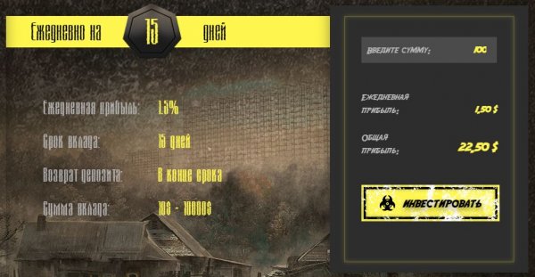 Тариф 1 Срок работы депозита: 15 дней Минимальный депозит: 10$ Максимальный депозит: 10 000$ Начисления: 1.5% в сутки Ваш доход: +22.5%