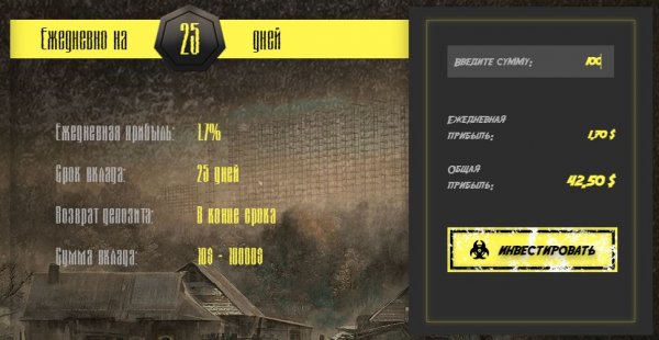 Тариф 2 Срок работы депозита: 25 дней Минимальный депозит: 10$ Максимальный депозит: 10 000$ Начисления: 1.7% в сутки Ваш доход: +42.5%