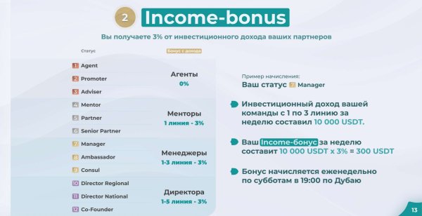 Если вы активно помогаете развиваться своим партнёрам первой линии и они достигают каких то статусов, получая бонусы, вы будете иметь 10% от их бонусов.